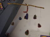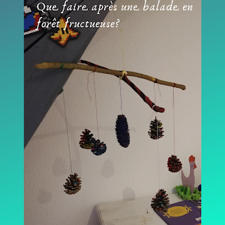 - attacher les pommes de pins avec un fil puis les accrocher aux bâtons pour former un mobile